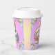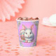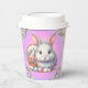 An adorable white Easter bunny is ready with a basket of Easter pastel eggs and spring flowers is ready for hiding on Easter morning on this paper cup for any Easter brunch.