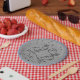 A modern combination of a grey granite stone background, pen and ink bunny rabbits and a light blue border band is trendy yet seasonal for Easter and spring! Perfect for an Easter brunch, picnic or anytime during the year. Whimsical, unique, original artwork & design by Tuzi Williams.