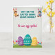 This greeting card features a light gray background with a faint speckled shimmer and a springtime joke set front and center. Across the top, a teal question in rounded lettering asks, “WHY DID THE EASTER BUNNY LEAVE SCHOOL?” and it’s framed by two cute, wide-eyed children who lean slightly inward like close friends sharing a secret 🐰. One child wears a sunny yellow hood with long animal ears, and the other wears an aqua hood with matching ears, both smiling warmly while holding small woven baskets. Beneath the question, the punchline “He was egg-spelled,” appears in bright magenta, written in a flowing cursive style that curves gently across the middle. The lower half turns into a rolling green field sprinkled with tulips in several colors, adding a soft garden feel 🌷. Three large decorated eggs sit prominently in the grass—one purple, one teal, and one golden yellow—each outlined clearly against the green. White decorative details cover the eggs, including wavy swirls, dotted patterns, and tiny star-like flowers.
