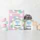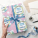 This gift wrapping paper features a cute and colourful Easter theme on a baby pink coloured background with white polka dots. A pastel coloured swirl pattern borders the sticker in shades of pink, green, blue, and purple. The title "Easter Bunny Official Seal" is printed in a circular pattern over a yellow banner, to resemble an official seal. The Special Delivery label is printed in the centre, followed by a sample name which you can personalise to include your own custom name or text.