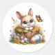 Round sticker is shown with a cute Easter bunny art print.