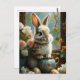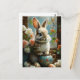 A fluffy bunny is sitting in an intricately painted china tea pot, surrounded by flowers and painted eggs