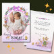 Your baby picture would fit easily in this beautifully crafted photo card with a bunny, chicks, and cute floral around an egg-shaped template for your photo. The back side has a greeting with more bunny and chicken illustrations. This is a unique card, and all items have been painted by hand.