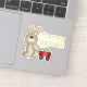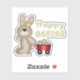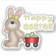This cute Easter sticker shows a a little brown bunny with a yellow bow pulling a red wagon filled with decorated Easter eggs. The stylised text above the wagon says "Happy Easter" in pastel yellow.