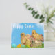 Vintage Easter chicks background with blue sky, grass, and cute Easter eggs.