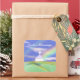 Stickers with my digital artwork of a church on green hills with a rainbow and blue sky above. Customisable text says "Easter Blessings".