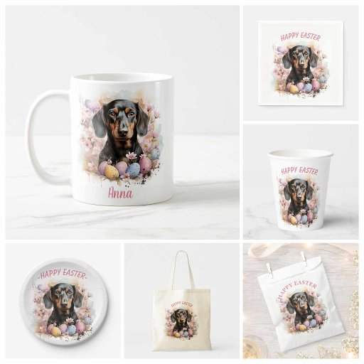 Happy Easter stickers featuring a watercolor dachshund with flowers and Easter chocolate eggs. Customisable.