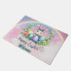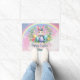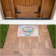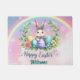 Welcome Easter bunny with flowers coloured eggs and rainbow doormat