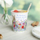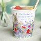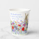 Modern Easter brunch and egg hunt personalised family name paper cup with cute Easter bunny and colourful watercolor wildflower meadow. Ideal for spring garden party. Cornflower blue handwriting typography script with easy to use templates so you can add a family name. whimsical design perfect for a spring garden party Easter egg hunt. Original artwork by artist Catherine Sweetman