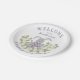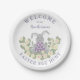 Easter egg hunt bunny floral paper plate ideal for a spring garden party and Easter brunch and a great way to welcome your guests. Yellow handwriting typography with easy to personalise templates. Cute Easter bunny holding a big yellow and purple spotted Easter egg sitting in spring foliage and daisies. An adorable simple modern design, perfect for a spring garden party this Easter. Original artwork by artist Catherine Sweetman