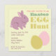 An Easter egg hunt invitation featuring an illustration of a purple bunny at top left and pink and yellow Easter eggs at bottom right. Personalise the text with details of your occasion.