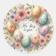 Easter eggs and flowers and foliage surrounding the words "He has risen"