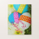 11” x 14” customisable jigsaw puzzle with an image of white and blue Easter eggs wrapped in colourful polka dot ribbons lying on green grass amid pretty white chrysanthemums. See the entire Easter Puzzle collection in the HOLIDAYS section.