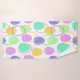 This towel set has a purple washcloth, a green hand towel, and a bath towel with an Easter design of eggs in purple, yellow, green, blue, and pink scattered about with their outlines.