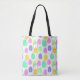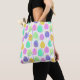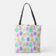 This tote bag has a Easter design of eggs in purple, yellow, green, blue, and pink scattered about with their outlines.