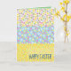 This delightful design features three coordinating patterns. One has colourful Easter eggs, the second one has delicate flowers and the last pattern has bright coloured dots. In the lower right corner, "HAPPY EASTER". You can customise the text on the inside.