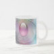 A pastel blue, lavender, and pink design with a translucent pink egg in a silver filigree setting, circled by a light silver oval frame set with four more smooth gems like colourful eggs.
