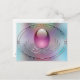 A pastel blue, lavender, and pink design with a translucent pink egg in a silver filigree setting, circled by a light silver oval frame set with four more smooth gems like colourful eggs.