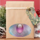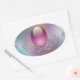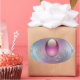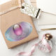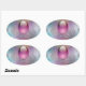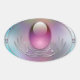 A pastel blue, lavender, and pink design with a translucent pink egg in a silver filigree setting, circled by a light silver oval frame set with four more smooth gems like colourful eggs.