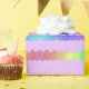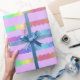 Wrapping paper decorated with rows of brightly coloured Easter eggs on a lavender background.