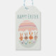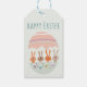 Gift label with fun illustration of 4 Easter bunnies at the table. On the table egg cups with an egg inside. Text "happy easter". The text can be customized.