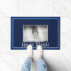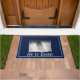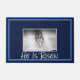 Doormat shown with a deep sapphire blue background, blue and gold coloured borders surrounding an image of a holy bible's page with an image of a thorny crown forming a heart shape in the centre crease of the bible printed on in centre of doormat. He is Risen in very large silver-grey colour text beneath the image.
