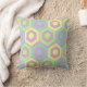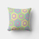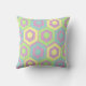 This throw pillow has a geometric design of hexagons in pale blue, pale yellow, and pale green on a field of stripes in pale pink and pale purple.