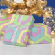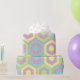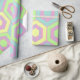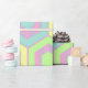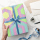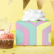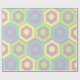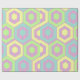 This wrapping paper has a geometric design of hexagons in pale blue, pale yellow, and pale green on a field of stripes in pale pink and pale purple.