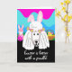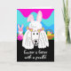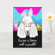 Easter is Better with a Poodle, paper greeting card with a white poodle on black with Easter egg, Easter bunny, green grass, bunny ears, and colourful wavy background. Art, image, and verse copyright © Shoaff Ballanger Studios, 2022.