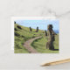 Photograph of those mysterious Easter Island head statues set into a lush green hillside with a small footpath nearby