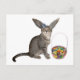 Kitten with rabbit ears sits by a basket of coloured Easter eggs. Spring postcard.
