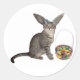 Kitten with rabbit ears sits by a basket of coloured Easter eggs. Use these stickes on your Easter cards.