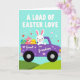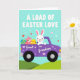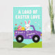 Designed with a sweet spring scene, this card features a white rabbit character driving a stylised purple pickup truck across rolling green hills under a pale aqua sky 🐰. Small heart shapes drift around the scene, adding a gentle, affectionate mood, as if the driver is delivering a caring surprise to someone special. At the top, the phrase “A LOAD OF EASTER LOVE” appears in large uppercase letters, set in a light-toned colour that stands out clearly against the sky. On the side of the truck, the words “Great Grandson” are printed in a contrasting light colour, placed like a label on the door panel. In the truck bed, a smaller pink rabbit relaxes among decorated eggs, with patterns like stripes and dots in blues, yellows, and reds 🐇. A few tiny hearts also decorate the truck body, tying the message to the imagery without crowding the layout. The background stays simple with soft clouds of colour, and the green hills form a smooth band along the bottom edge.