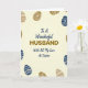 This card features a romantic Easter message centered on a soft cream background, with the words “To A Wonderful HUSBAND” set large in dark lettering. Just below, “With All My Love At Easter” appears in a smaller line, neatly aligned under the main phrase to feel like a tender add-on. Around the edges, a border of decorated egg shapes creates a gentle frame, like a quiet celebration surrounding the couple’s words 🌷. Some eggs are deep blue with white stars and curved stripes, adding a calm, night-sky contrast to the warm center. Others are golden-brown with fine white lace-like details and zigzag patterns, suggesting careful attention and a steady, affectionate bond 🐇. The layout keeps the text as the focal point while the patterned eggs guide your eye around the perimeter. White star accents and thin stripe details stand out crisply against the blue eggs near the corners.