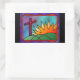 A stained-glass design illustrating Easter morning, with a red cross standing on green hills beside a fiery sunrise.