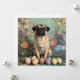 Cute pug Easter botanicals postcard. Rustic style picture of a fawn pug dog with Easter eggs and floral botanicals.