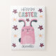 Easter puzzle for children, with flowers and a cute pink cartoon bunny. The caption reads Happy Easter.