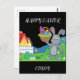 Colourful Easter bunny, basket, & house postcard with personalised name for kids.