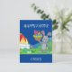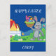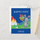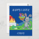 Colourful Easter bunny, basket, & house postcard with personalised name for kids.
