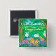 A bright and colourful button pin sticker for Easter featuring three curious white rabbits looking at bright Easter eggs in a spring meadow with a shy owl in a tree and blooming purple crocus. Fun button for the holiday!