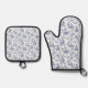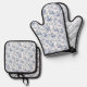 Charming Spring themed pot holder and oven mitt set features a blue and white Chinoiserie Toile de Jouy pattern with bunnies, butterflies and spring blooms.
