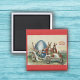 This square Easter Greetings magnet has a vintage image of two rabbits in an antique white car with a big blue Easter Egg on a red background with the text Easter Greetings.