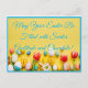 A vibrant Easter scene unfolds with a gentle zoom-in on a colorful array of Easter eggs and blooming flowers. Tulips sway softly in the breeze, while cheerful daisies add a touch of brightness. The camera glides smoothly across the table, capturing the playful arrangement of eggs in pastel hues. Warm, diffused sunlight bathes the scene, creating a joyful and inviting atmosphere. The composition is lively, with a focus on the cheerful colors and textures, evoking a sense of celebration and gratitude.