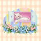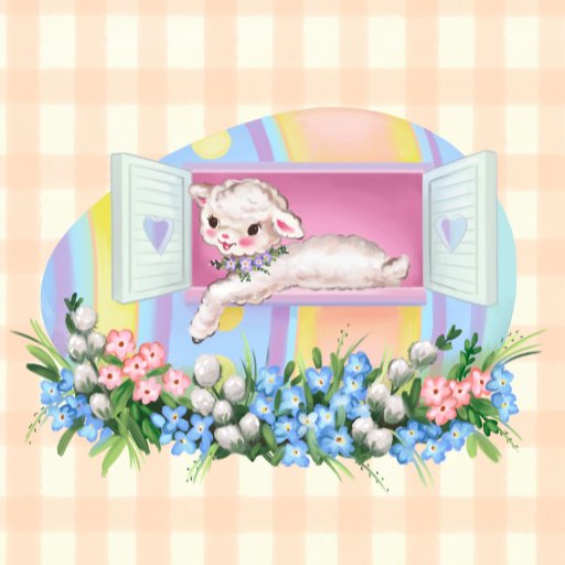 A soft, little, spring lamb pokes its head out the window of a colourful easter egg abode adorned with an assortment of Spring flowers. Illustration by Noël Snow.