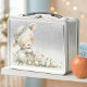 This is a standard metal lunchbox that appears to work just fine. We designed this box ourselves with an uploaded photo and custom text on the front and back. It looks absolutely beautiful except the front of the lunchbox is not centered like it shows in the photo. The print borders don't align with the inset flat part of the box where the preview photo online showed it perfectly centered in there. The back looks nice and centered though.