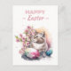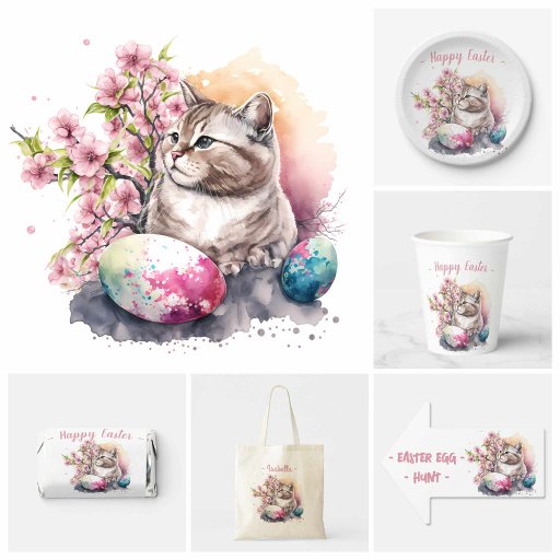 Easter postcard featuring a cat with cherry blossoms and Easter eggs. Customisable.