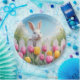 A curious white rabbit pokes its head over a white picket fence, surrounded by vibrant tulips in shades of pink and yellow.