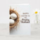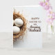 Designed with a cozy still-life feel, the left side features a carefully woven nest of dried golden-brown twigs and straw that looks like a gentle cradle. Tucked inside are three smooth, speckled off-white eggs, close together in a way that suggests a quiet, affectionate bond like partners leaning in. Soft, ambient lighting warms the straw’s tiny strands and keeps shadows light, giving the scene a calm, intimate tone. Most of the right side is an open white background with a faint texture, creating space that feels airy and springlike 🌷. Across that bright area, the message “HAPPY EASTER TO MY Amazing Husband” is placed prominently in rich brown lettering. “HAPPY EASTER TO MY” appears in a simple, modern print style, while “Amazing Husband” shifts into a flowing cursive look for a more romantic touch 🐇. The nest sits in the left third of the layout, and the brown text is centered on the right against the softly textured white field.