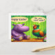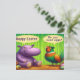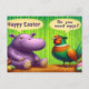 Experience the joy of Easter with this delightful illustration. A friendly purple hippo extends warm greetings, while a vibrant pheasant perched on a rock asks if you need eggs. The bright green background with bamboo designs adds a natural and playful feel. Speech bubbles clearly convey the characters' messages, making the scene engaging. The cartoonish style and vivid colours create a cheerful atmosphere. This image is perfect for spreading Easter cheer and bringing a smile to viewers.