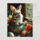 A fluffy bunny is sitting in an intricately painted china tea pot, surrounded by flowers and painted eggs